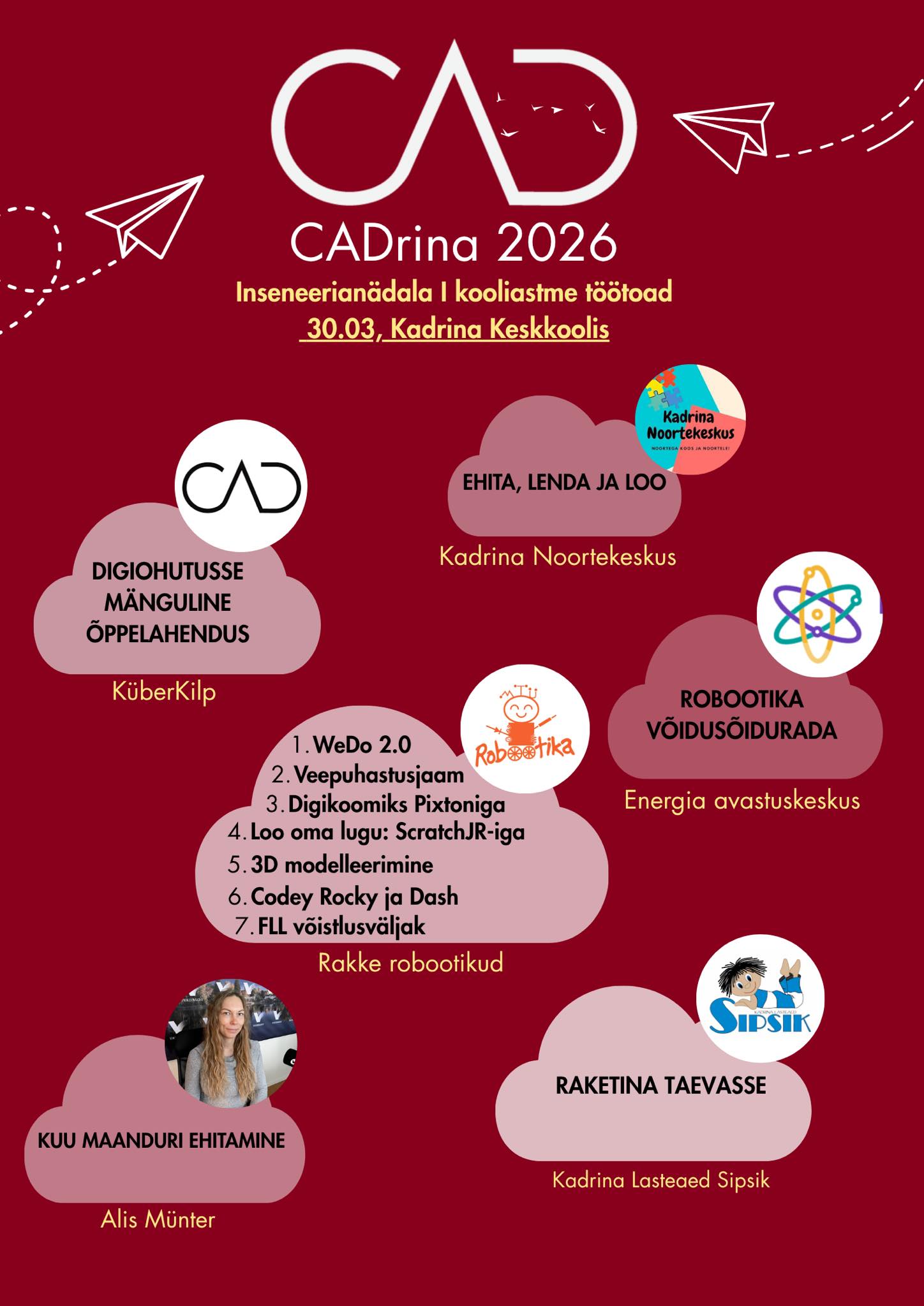Külla tulevad mitmed ägedad tegijad: Küberkilp, Rakke robootikud, Energia avastuskeskus, Kadrina Lasteaed Sipsik, Kadrina Noortekeskus ning meie oma füüsikaõpetaja Alis Münter.
